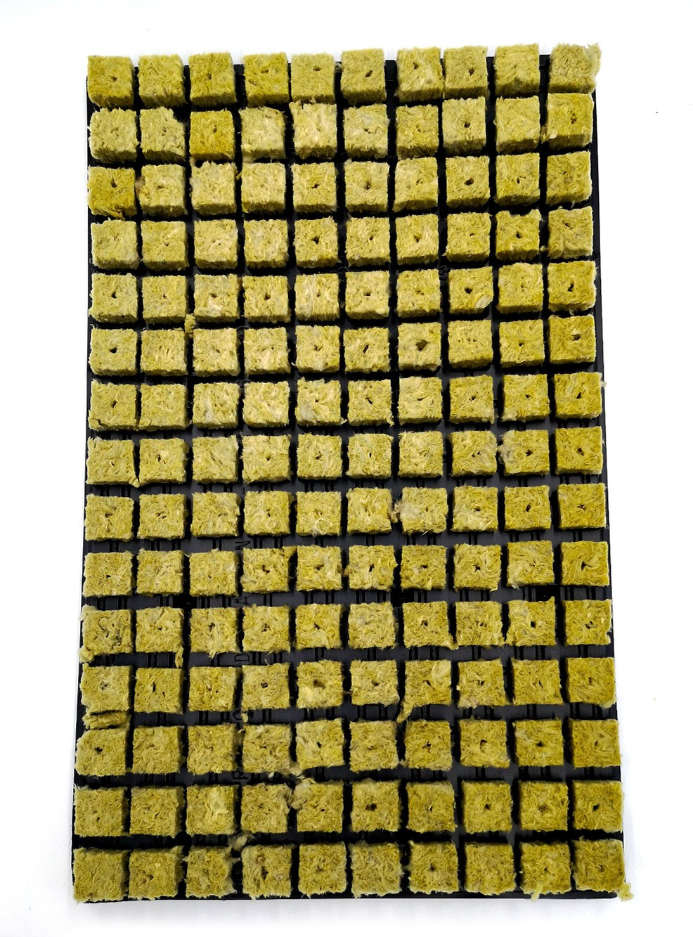 This tray contains 150 small cubes (approx. 2 × 2 cm) mounted on a breakable plastic tray, making it ideal for intensive propagation, nurseries, and commercial growing operations.
