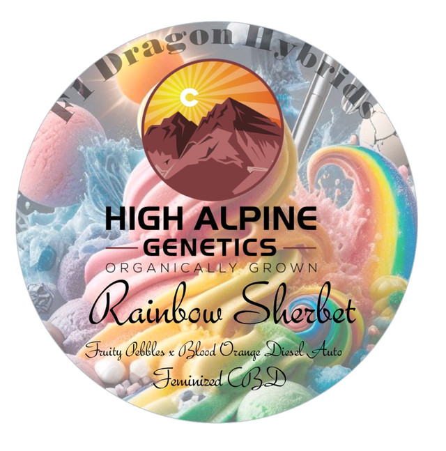 Rainbow Sherbet est un cultivar Type 3 CBD (< 0,3 % THC) par High Alpine Genetics, hautement expressif, Hybride à dominance sativa issu des prestigieuses croisements Fruity Pebbles × Blood Orange Diesel.
