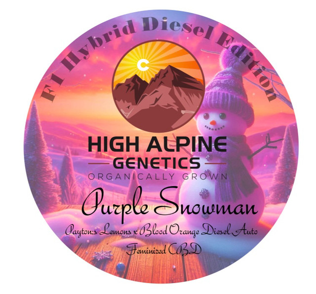 Purple Snowman est une sélection exclusive de High Alpine Genetics Type 3 CBD (< 0,3 % THC), issue d’un croisement prestigieux entre Payton’s Lemons et Blood Orange Diesel.