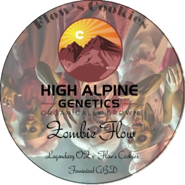 Zombie Flow de High Alpine Genetics est une variété Type 3 CBD (< 0,3 % THC), développée à partir du croisement entre Legendary OZ x Flow's Cookies (Blueberry muffin x Sour Space Candy x Chocolate Chip Cookie OG)).